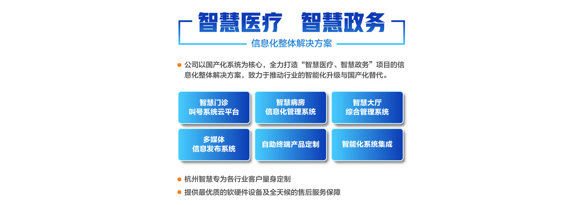 杭州智慧科技有限公司初創(chuàng)于2003年,總部位于重要的電子商務(wù)中心中國杭州公司主營業(yè)務(wù)有:智慧分診叫號(hào)系統(tǒng)、智慧病房醫(yī)護(hù)對講系統(tǒng)、智慧大廳綜合管理系統(tǒng)、智慧政務(wù)管理系統(tǒng)、智慧多媒體信息發(fā)布系統(tǒng)、導(dǎo)診系統(tǒng)及各自助終端產(chǎn)品定制。專為各行業(yè)客戶量身定制。公司已有20余年行業(yè)經(jīng)驗(yàn)沉淀積累,擁有優(yōu)秀的產(chǎn)品外觀設(shè)計(jì)師和各類中高級(jí)專業(yè)技術(shù)工程師,確保所研發(fā)的產(chǎn)品具有行業(yè)領(lǐng)先的外觀及可靠的技術(shù)性能。并擁有權(quán)威部門頒發(fā)的各類知識(shí)產(chǎn)權(quán)及專利證書,30多項(xiàng)資質(zhì)證書、800多個(gè)合作伙伴、2000多個(gè)項(xiàng)目成功案例經(jīng)驗(yàn)。 智慧產(chǎn)品已遍及全國各醫(yī)療、政務(wù)、金融、通訊、公安、工商、稅務(wù)等行業(yè),形成以“立足杭州、輻射長三角、拓展全國”的戰(zhàn)略發(fā)展格局,產(chǎn)品經(jīng)過歷年不斷創(chuàng)新,形成專業(yè)化、平臺(tái)化,致力于成為智慧產(chǎn)品的領(lǐng)軍企業(yè)。 公司建立了完善的技術(shù)培訓(xùn)及售后服務(wù)中心,并設(shè)24小時(shí)熱線咨詢電話解答用戶反饋的問題。同時(shí)應(yīng)客戶要求定期派技術(shù)人員到 全國各地進(jìn)行技術(shù)指導(dǎo)輔助用戶正確使用智慧產(chǎn)品并能獨(dú)立安裝、調(diào)試、日常維護(hù)等工作。提供最優(yōu)質(zhì)的設(shè)備及全天候的售后服務(wù)保障,智慧永恒不變的服務(wù)宗旨——致力于客戶的滿意與成功!...